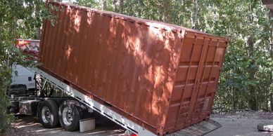 Tilt bed/roll-off delivery: the container arrives on a trailer that tilts back to set the edge of the container on the ground. The driver then pulls forward so the container slides (or rolls) off the trailer and onto the ground.